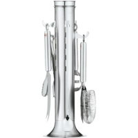Мощная матовая стойка диаметром 5 см на широком основании. Полированные стальные крючки плюс специальный крючок для длинной барной ложки. Позиция крючков по желанию. Барный мерный стаканчик устанавливается на верхушке стойки. В наборе: стойка, ложка, щипцы для льда, открывалка для бутылок, стаканчик (джигер), нож, сито (стрейнер)