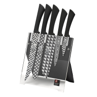 Набор ножей Love Colour Mono Geo состоит из пяти ножей: поварского, ножа для хлеба, сантоку, универсального, ножа для очистки и ножа для нарезки. Ножи изготовлены из нержавеющей стали. Покрытие на лезвии не позволяет прилипать кусочкам пищи и делает процес нарезки более комфортным. Каждый нож имеет уникальный монохромный принт. Колода изготовлена из полипропилена и органического стекла, позволяющего безошибочно выбрать нужный нож. Рукоятки изготовлены из мягкого силикона. Рекомендуется ручная мойка.