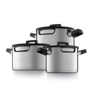 Особенности: кастрюли предназначены для всех видов варочных панелей, в том числе для панелей с функцией нисходящего потока; трехслойное капсульное дно для быстрого, равномерного распределения тепла и энергоэффективного приготовления пищи; не нагревающиеся ручки для дополнительного комфорта и безопасности; легко очищаются; стеклянные крышки со встроенными воздухоотводами; при повороте на 180 градусов крышка полностью закрывает кастрюлю; не подходят для духовки