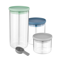 Набор контейнеров изготовлен из боросиликатного стекла, крышки - из качественного полипропилена. Благодаря силиконовому уплотнителю, крышка плотно прилегает к контейнеру. В набор входит три контейнера ( 0,4 л, 0,7 л, 1,3 л) и мерная ложка. Рекомендуется мыть вручную.