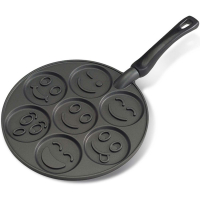 Сковорода изготовлена из литого алюминия с антипригарным покрытием, ручка - из пластика. Перед первой эксплуатацией рекомендуется вымыть сковороду и впоследствии мыть только вручную. Перед началом приготовления и каждой новой порцией, формы необходимо смазывать растительным маслом. После появления золотистой корочки по краям блинчика, его нужно перевернуть. Степень готовности советуем проверять зубочисткой или лопаточкой. Использование сковороды позволит вам порадовать близких блинчиками с оригинальными изображениями смайликов. Подходит для всех видов плит, кроме индукционных.