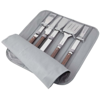 Набір для барбекю виготовлений із високоякісної нержавіючої сталі та є універсальним комплектом, оскільки включає всі необхідні інструменти для приготування на грилі. Завдяки довгим рукояткам, виготовленим з натуральної деревини, ваші руки будуть на безпечному віддаленні від джерела жару і при цьому ви зможете контролювати процеси всередині гриля. Предмети забезпечені петлею для зберігання у підвісному стані. У комплект також входить сумка для зручного транспортування інструментів. Рекомендується ручне миття.