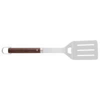 Лопатка для барбекю виготовлена із високоякісної нержавіючої сталі. Завдяки своїй формі ідеально підходить для приготування різноманітних страв на грилі. Рукоятка, виготовлена з міцної натуральної деревини, має достатню довжину для безпечної роботи з продуктами. Лопатка має петлю для зберігання у підвісному положенні. Отвори в площині лопатки позбавлять страву від надлишків жиру. За допомогою зазубреної кромки можна з легкістю перевірити страву на предмет готовності, тоді як рівний край ідеально підходить для перевертання. У верхній частині лопатки розміщено відкривачку для пляшок. Рекомендується ручне миття.