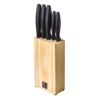 Особливості: леза ножів цілісні, що надає додаткової міцності, балансу та стійкості; колода виготовлена з високоякісної деревини світлого кольору, має нековзну основу