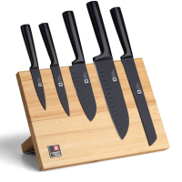 Особливості: леза виготовлені з високоякісної нержавіючої сталі MOV; рукоятки з натурального ясена, карбонізованого при температурі до 250°C для підвищеної міцності, стійкості до вологи та зносу; безшовне з'єднання лез та рукояток забезпечує додаткову гігієну; компактна, стильна та практична колода для зберігання