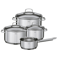 1 х Ківш, 16 см, 1 л 1 х Каструля з кришкою, 16 см, 1,5 л 1 х Каструля з кришкою, 20 см, 3 л 1 х Каструля з кришкою , 24 см, 5 л Набір посуду Elegance складається з ковша та трьох каструль. Посуд виготовлений із високоякісної нержавіючої сталі 18/10. Має тришарове капсульне дно з алюмінієвою вставкою, що дозволяє рівномірно розподіляти тепло та зберігати його тривалий час. Ківш ємністю 1л чудово підходить для кип'ятіння молока, приготування дитячих сумішей, соусів або крему. Каструлі універсальні у використанні, мають мірну шкалу на внутрішній поверхні стінок. Кришки виготовлені з термостійкого боросилікатного скла. Ручки із нержавіючої сталі зручні в експлуатації. Матове полірування зовні і всередині стійке до появи подряпин і гарантує прекрасний зовнішній вигляд. Набір підходить для використання всіх типів плит. Підходить для миття у посудомийній машині.